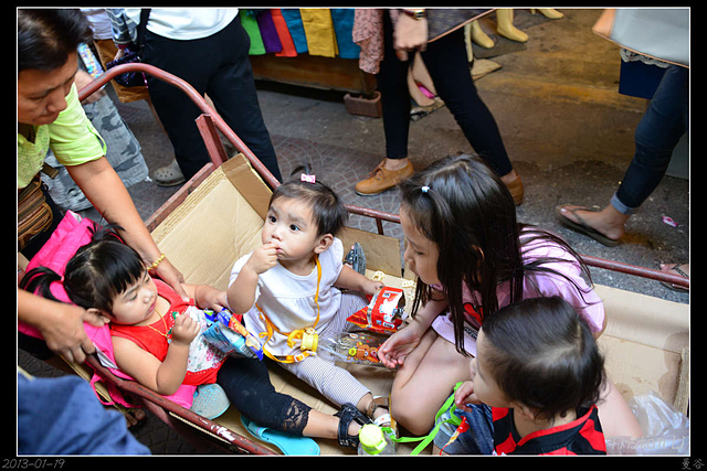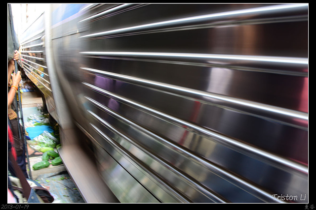 隨意逛逛,時間也差不多了。回到鐵道市場附近,一時沒動靜,但是突然之間,前頭人群開始騷動起來,賣菜的阿桑把較大的推車往後撤,往左往右看了看,發現我們家的小朋友站的太前面了,挪了個位子叫他們站到裡頭,用手勢向我們比了一下,意思是旁邊的鐵軌欄杆前最多只能站一個,然後就立刻站到她自己的位置,用手扶著鐵桿向後一拉,棚子後收,天空頓時亮了起來。一切動作井然有序,不過是個再平常不過的事,她們的心裡大概就這麼認為