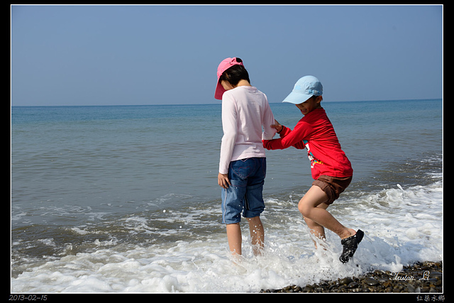 我們沒給小朋友準備泳裝,兒子倒很爽快,上衣一脫,就衝下去,女兒放不開身手,只能挽起褲管,在旁邊潑潑水