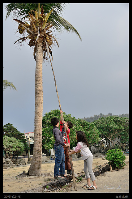 有人還想學猴子上樹摘椰子!不知去哪裡搞了根竹竿,可惜太重了吧!
