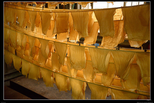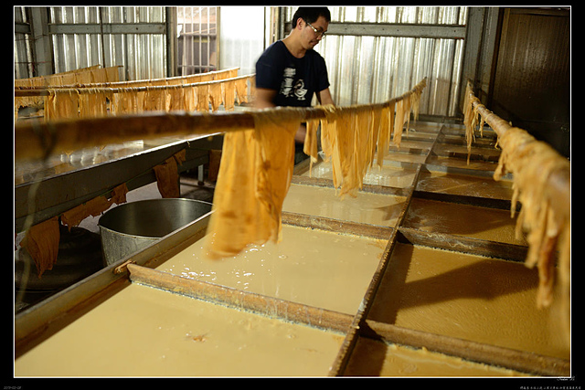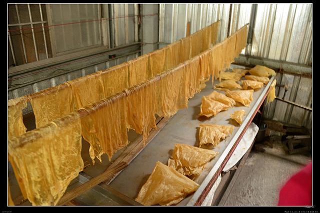 鐵皮屋內,一盤盤的豆漿上,凝結而成的豆皮,在師傅熟練的動作下,被撈上陰乾,就變成了豆皮