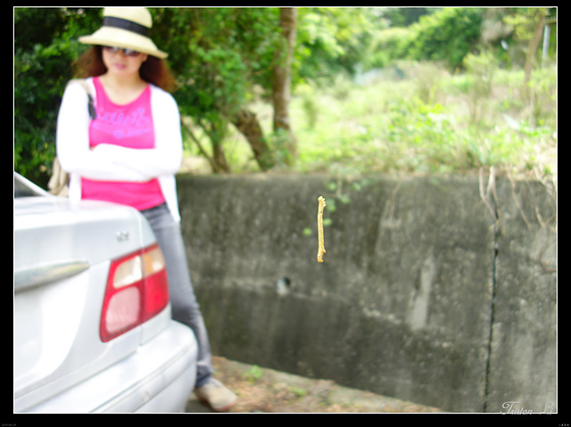古道附近四處可見掛在空中的毛毛蟲,如果小禎禎來到這裡,鐵定嚇的花容失色,這毛毛蟲很厲害,不知道從多高的樹枝上吐了絲,把自己弄得像根樹枝懸在空中,如果不小心走路碰到牠,就會沾在衣帽或身上,搭你的便車。不曉得牠這麼用心的演化成這樣,是為了捕食,還是繁衍?或是藉助其它動物帶牠去旅行?