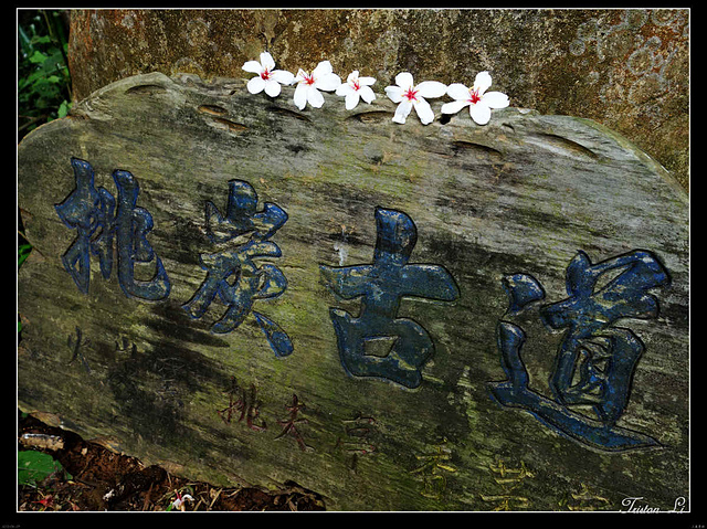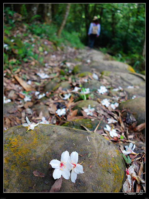 挑炭古道不長,大約廿分鐘就走到嶺上一個交叉點,石牌已有先來的人供了五朵桐花,倒省事,相機拿來拍了就是