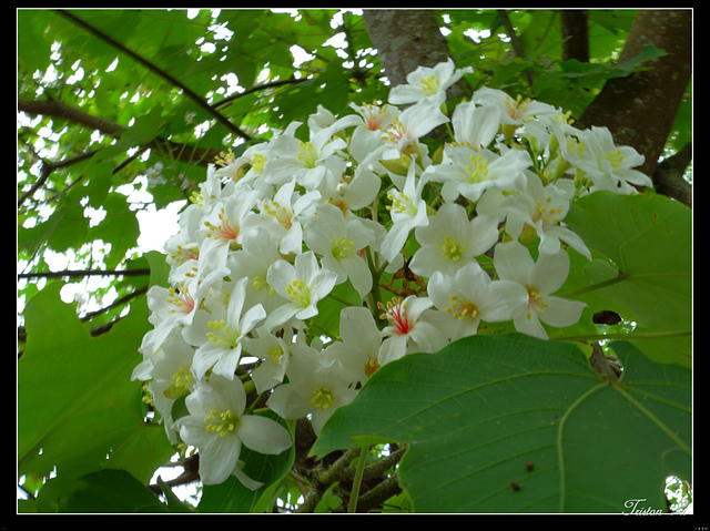 樹上的油桐花,花絲依成熟的程度,先綠再黃而紅,等變紅就準備要落下了。