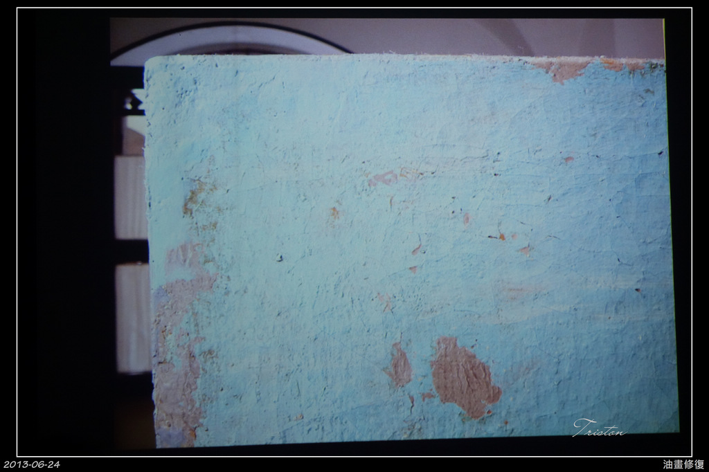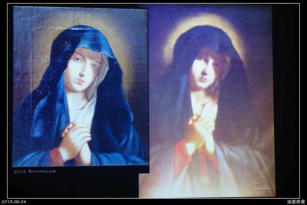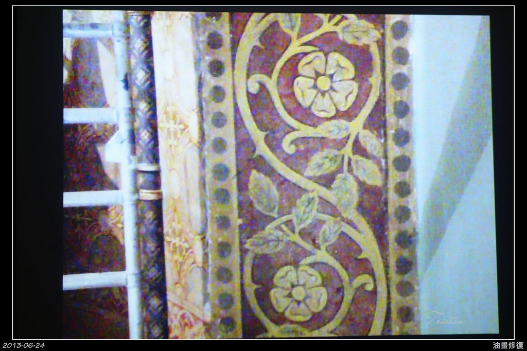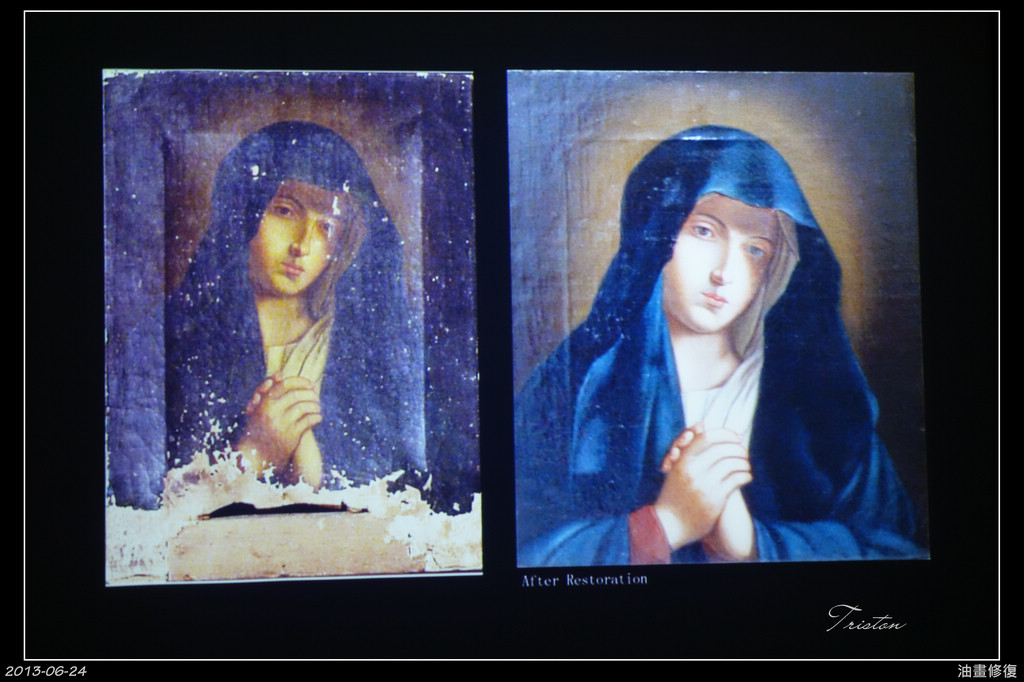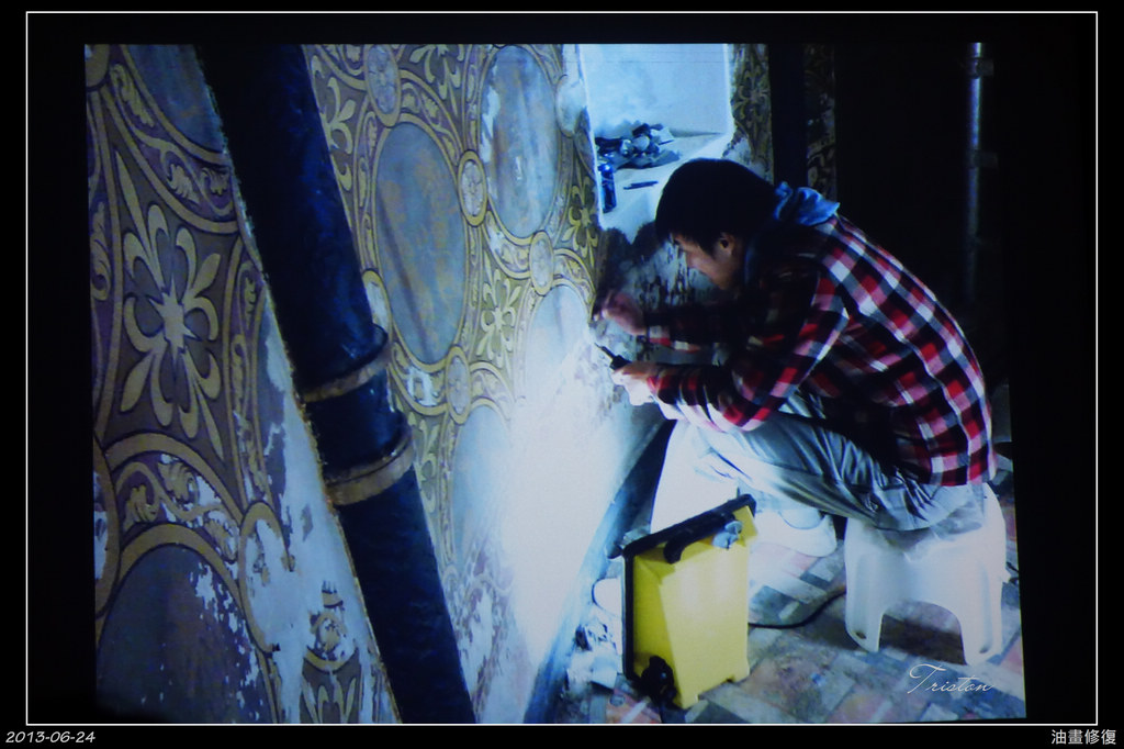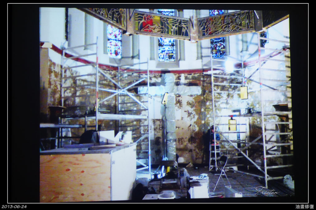 祭壇壁畫修復,要先把歷代主教所上的油漆先去除,又不能傷到內層的原作。