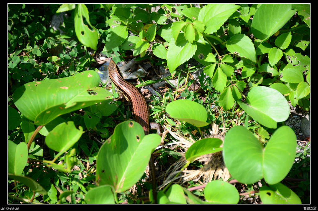 路邊看到好肥的一隻成年麗紋石龍子,全身己經褪成額褐色,如果是未成年的麗紋石龍子,黑漆漆加稍胖的身材配上五條黃線條,才真是絕佳的配色!
