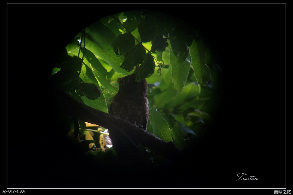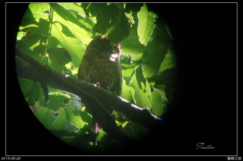 相機的鏡頭不夠遠,從賞鳥鏡的目鏡拍拍看。角鴞的耳羽己經翹起來,雙眼炯炯有神地看著我們,看來牠也正在觀察我們的動作呢!事實上,當年也就因為那高翹起來的耳羽,像兩隻角,所以才被分到"角鴞"屬。在達悟族的傳統裡,貓頭鷹被視為"惡魔使者",是不祥的象徵!