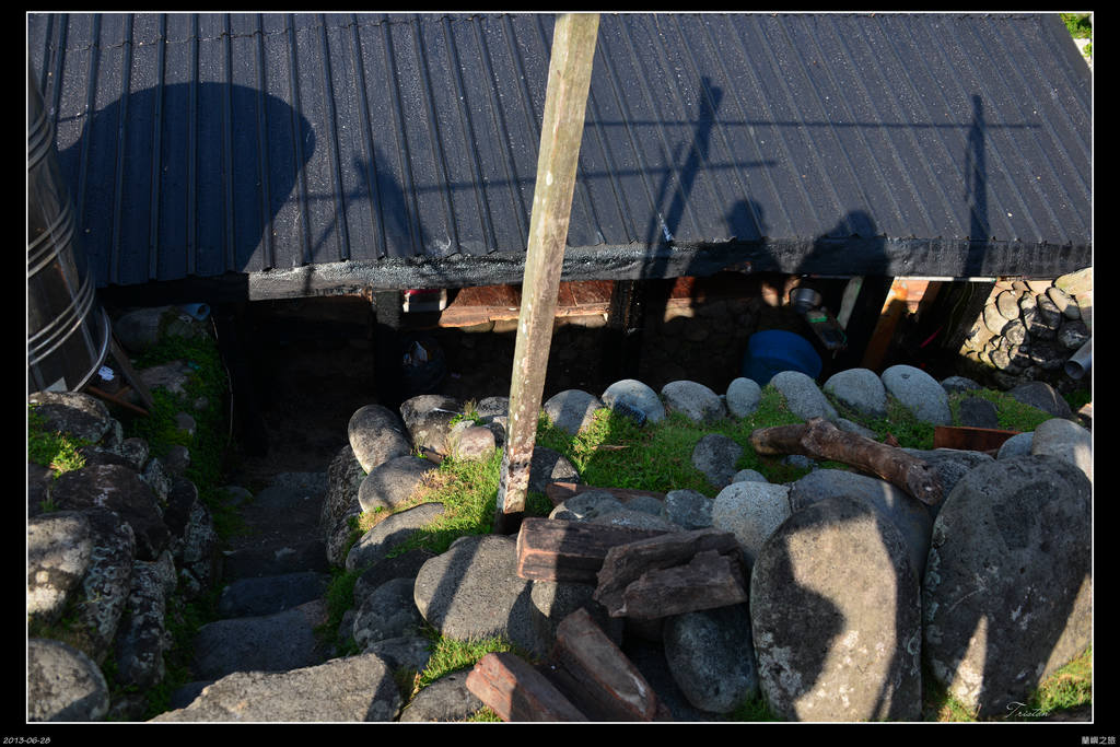 進入主屋,主屋是用木板架成,屋頂是茅草,上覆塑膠皮、再舖上一層瀝青。由於海邊風大,主屋呈現於半穴居