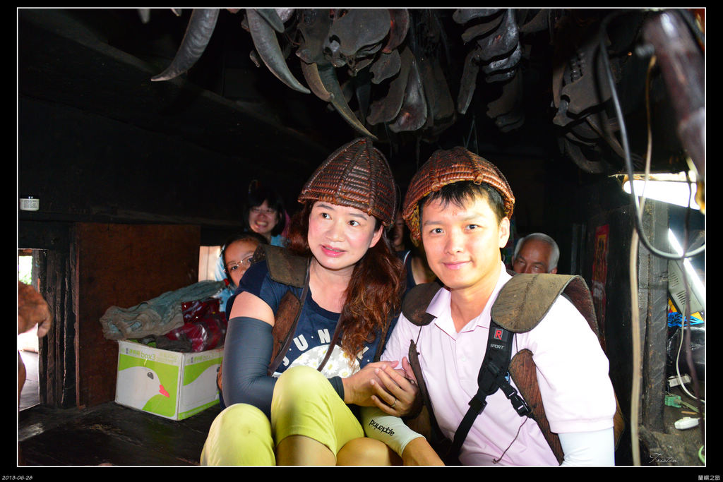 廖先生為我們穿上達悟族男子魚皮盔甲和藤盔,盔甲的材料是由水藤及剝鯙科魚皮所縫製編成的盔甲衣。達悟族的傳統盛服盔甲(戰甲),是祭典、驅邪、辟靈與戰鬥時候的穿著,雖然叫做「戰甲」,但並不是用之於戰爭。