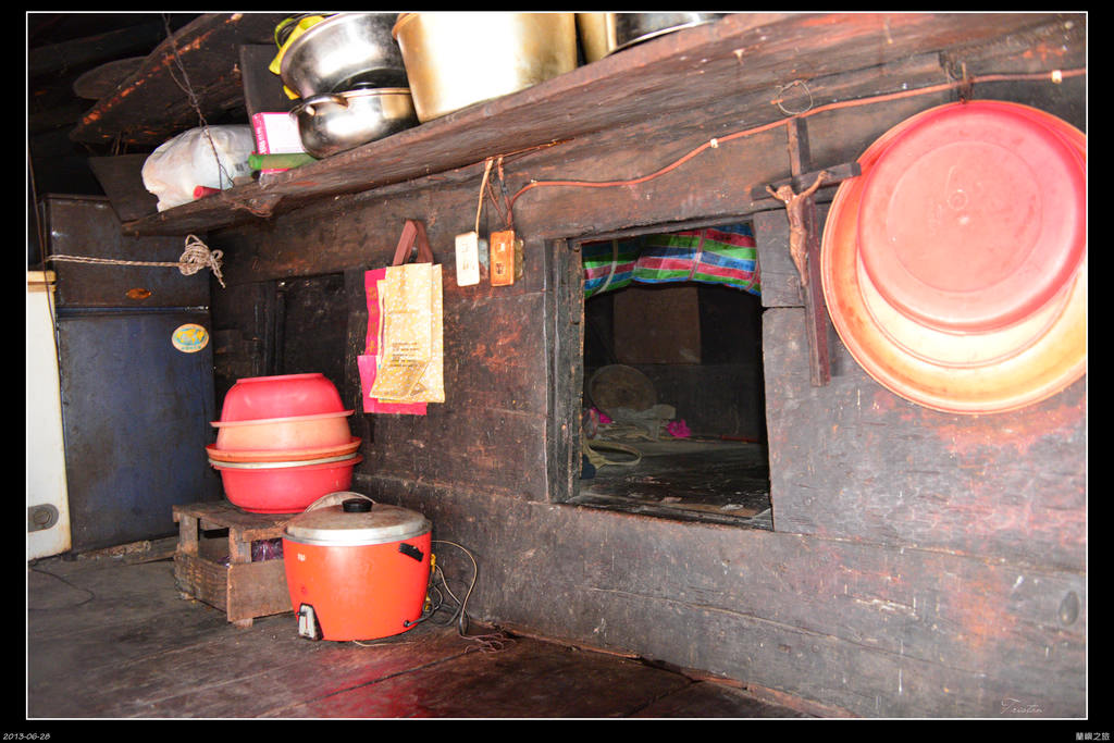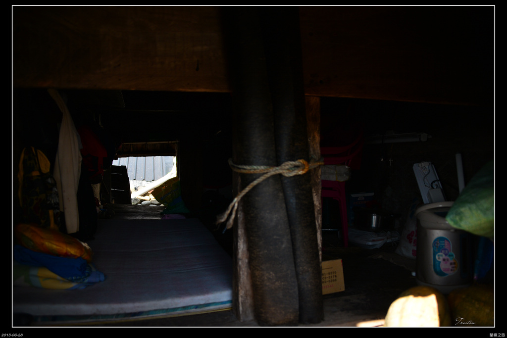 裡面高度是標準的一百四十公分,只能坐著或睡覺。格局是平行的前後房,沒隔間的,第一層是睡覺和廚房(直接睡在灶旁的地板上)的大通舖...