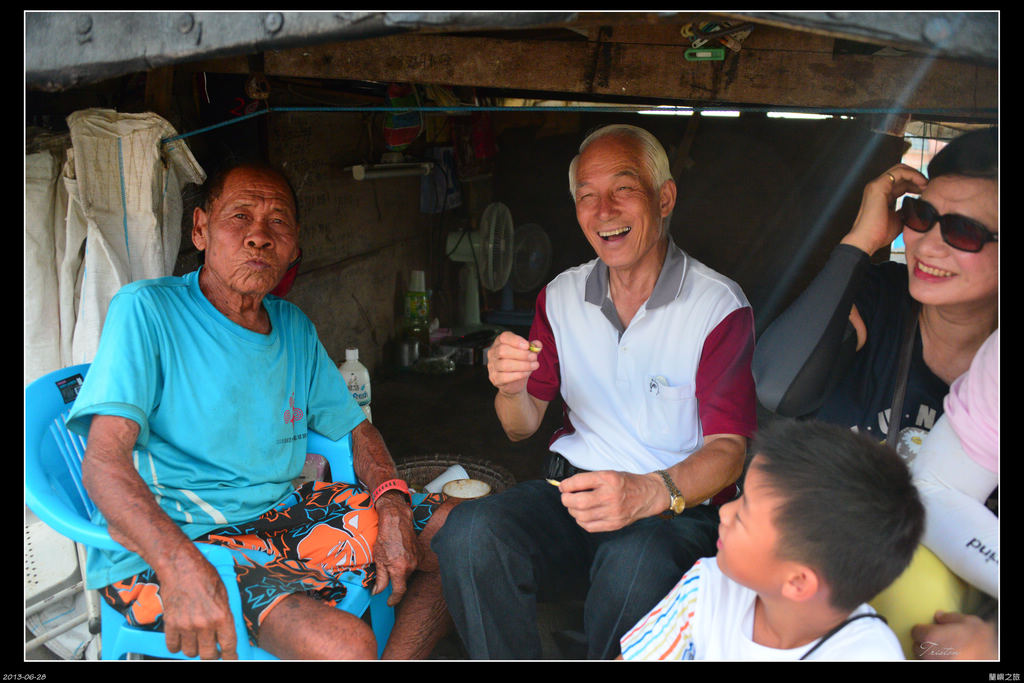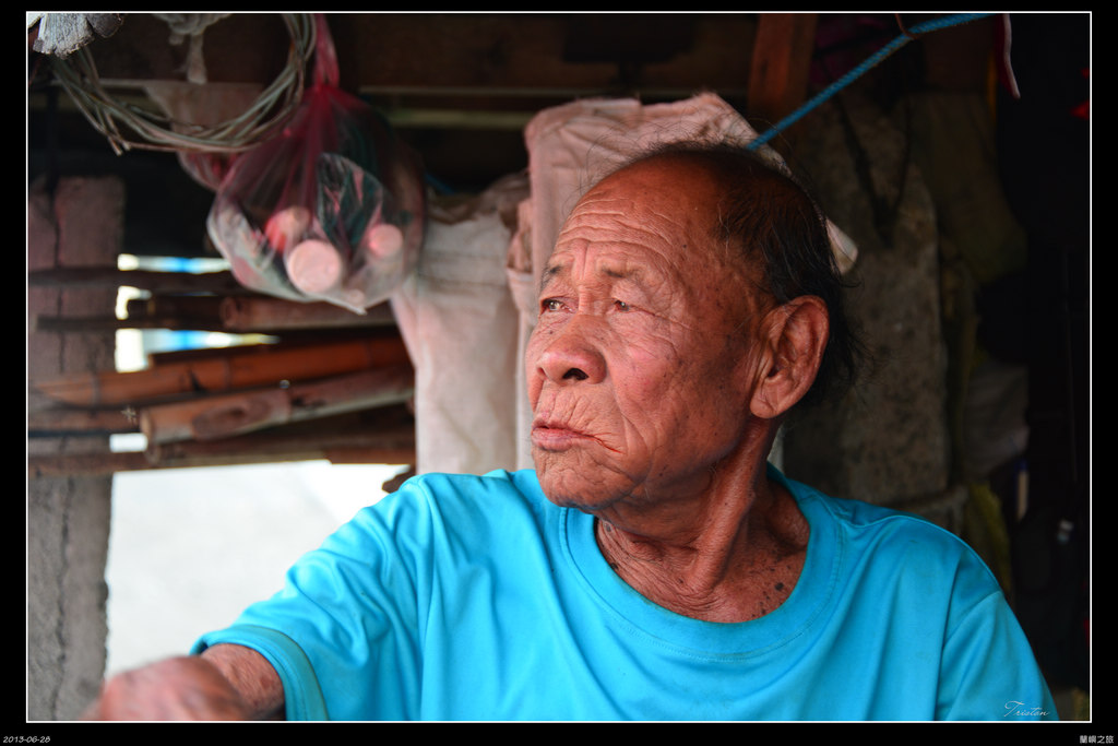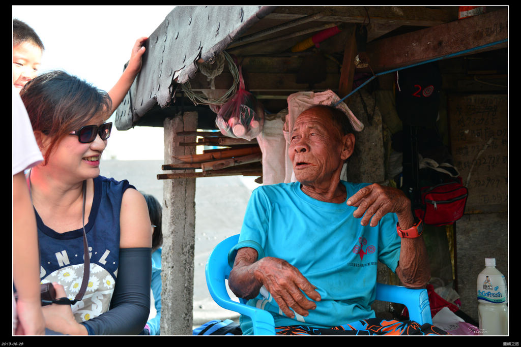 廖先生高齡86歲,白天就坐在涼台吃檳榔,喝威士比,和遊客拍照啦!