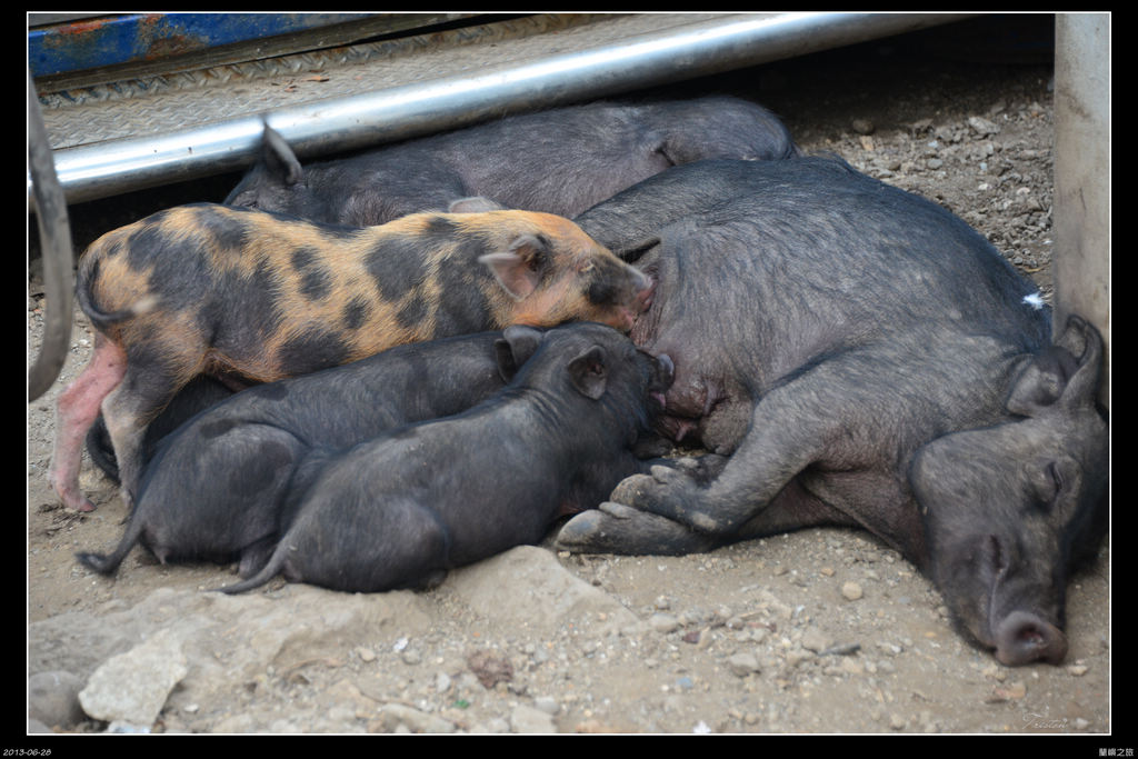 路邊的蘭嶼豬是小型黑色豬種,外表特徵是耳小豎立、體型小巧、四肢細短、毛質粗短而黑、鼻吻略微尖長,,又名小耳種豬,但體型亦小,故亦稱迷你豬。隨地而養,卻沒有台灣豬的騷味