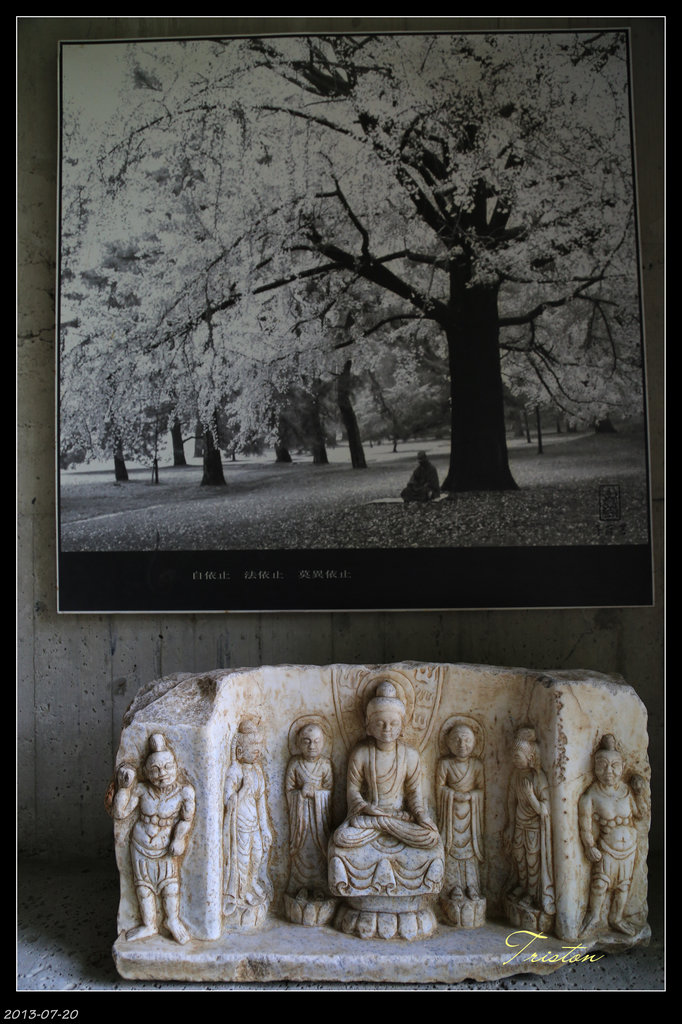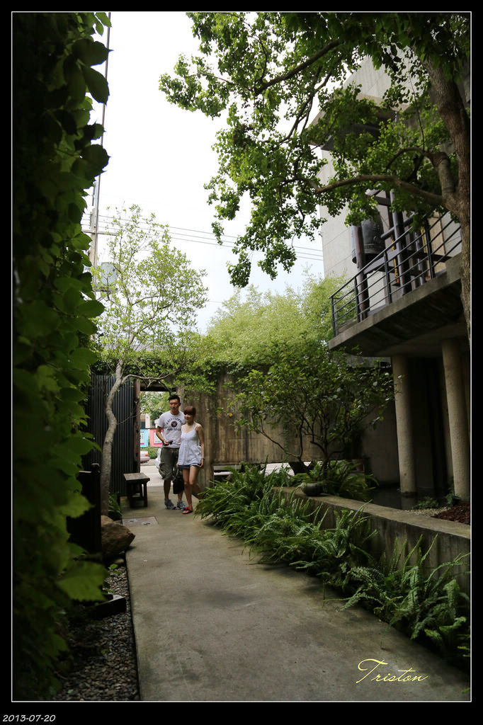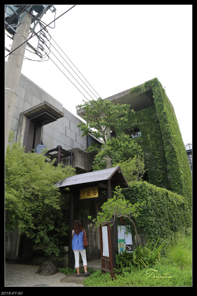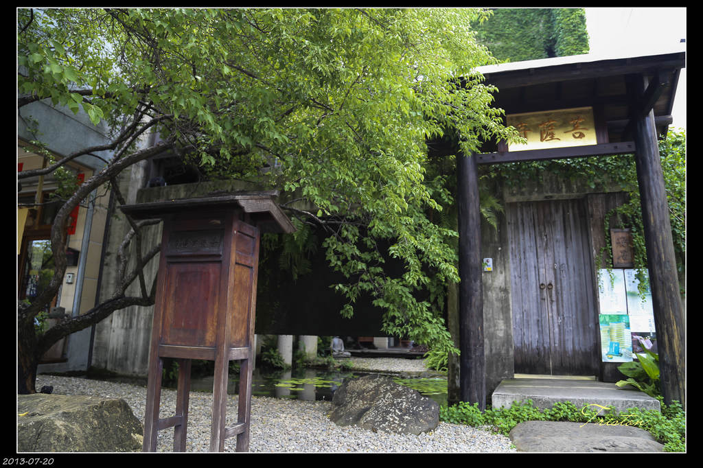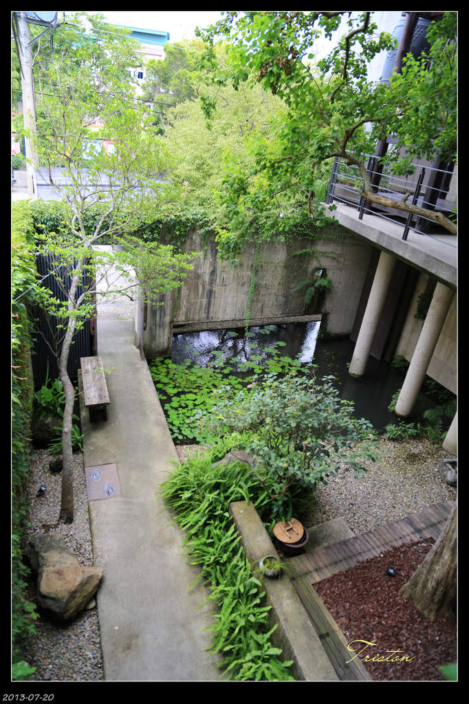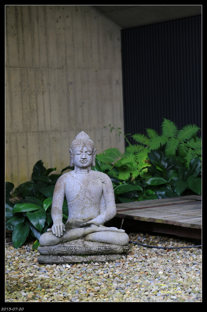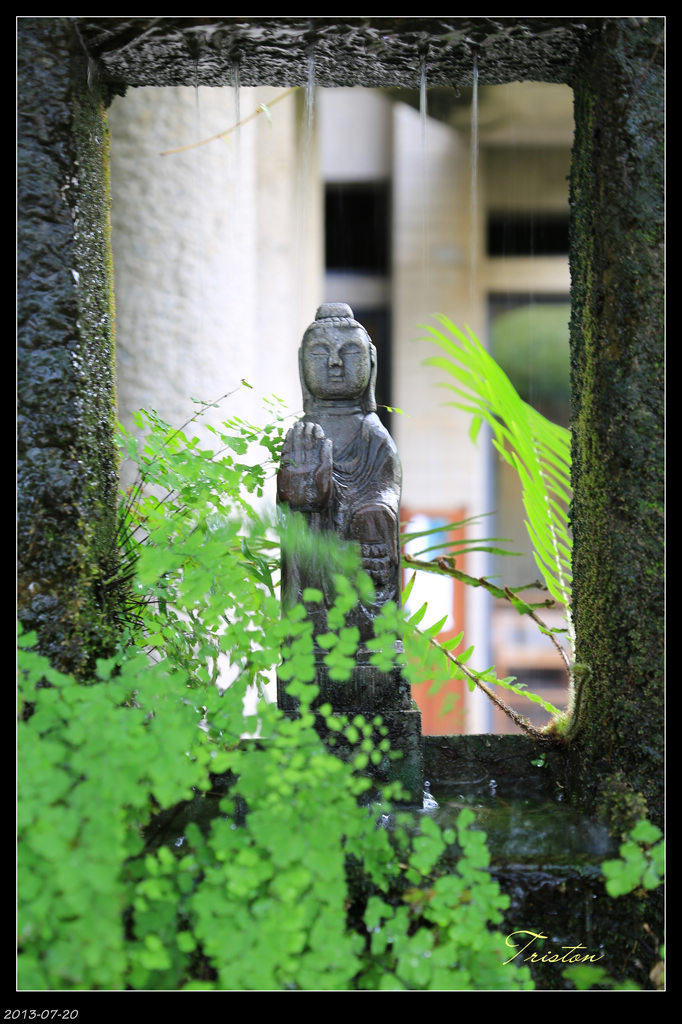 回轉一樓庭外,水瀑自矮牆瀝瀝而下,雖在牆外,也可見佛,但求滌心淨性!